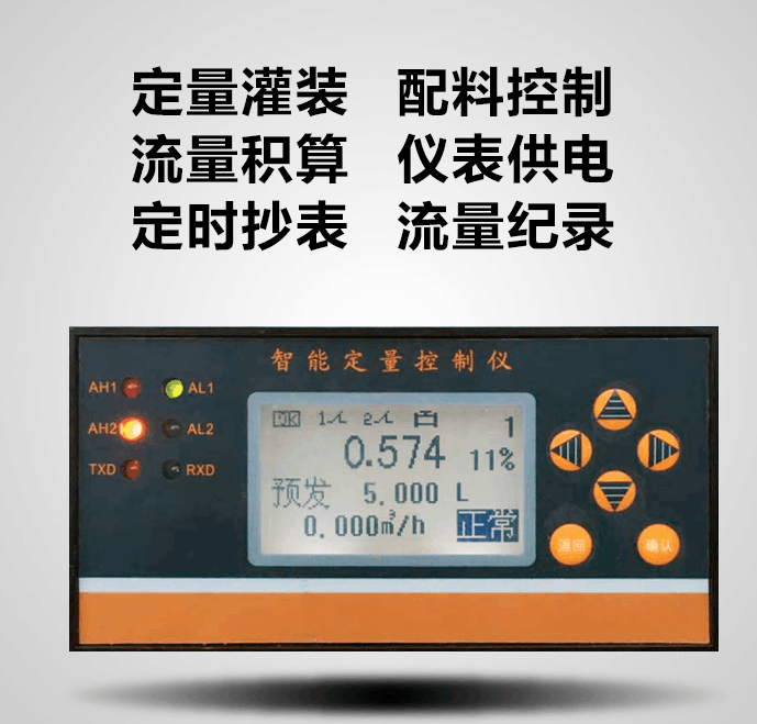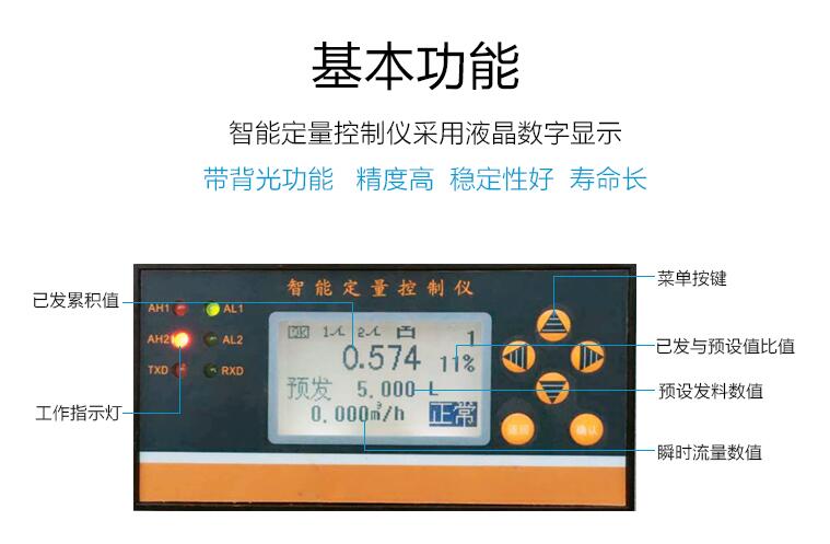 4、定量控制儀顯示參數(shù)包括本次累積、總累積、瞬時(shí)流量、時(shí)間、流量計(jì)輸入信號值等;