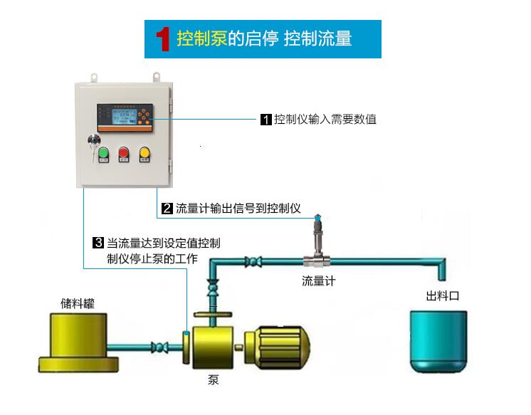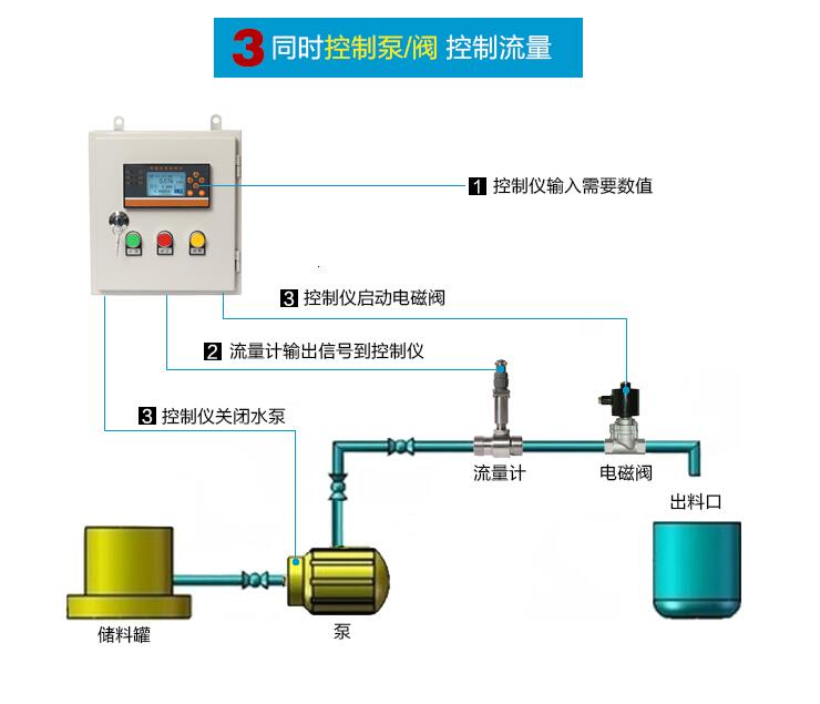 通過流量計(jì)測量流量 ,控制儀表接收信號,在控制儀表里設(shè)置定量值。定量值達(dá)到后電磁閥、水泵 斷電停止工作。