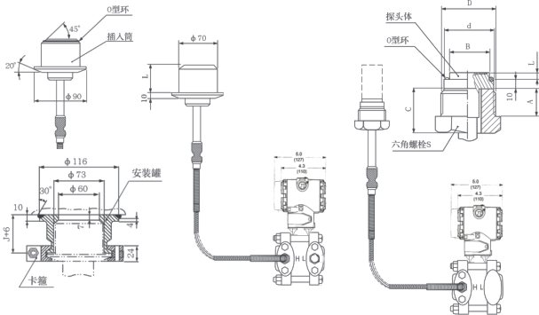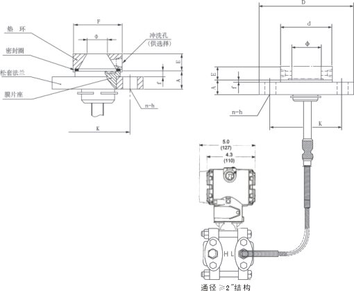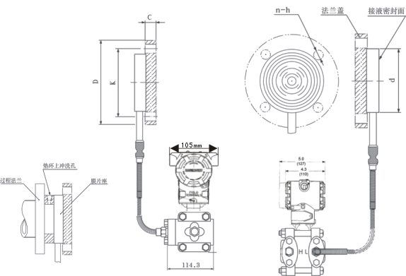 AK-3051GP單法蘭液位變送器是一種通過安裝在管道或容器上的遠傳裝置來感受被測壓力,該壓力經毛細管內的灌充硅油(或其它的液體)傳遞至變送器的主體,然后由變送器主體內的δ室和放大線路板,將壓力或差壓轉換4~20mA.DC信號輸出(參見結構原理圖)。 |