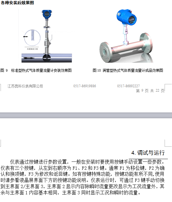 4) 根據(jù)現(xiàn)場測得的數(shù)據(jù)換算出在傳感器連接桿上的相應(yīng)刻度,鎖緊螺母即可。5) 如果您是橫向安裝的本款儀表的顯示屏可以90°180°270°的靈活安裝,滿足你現(xiàn)場實(shí)際需要。 參照附錄3圖(滿管型熱式氣體質(zhì)量流量計在預(yù)安裝前請?jiān)俅未_認(rèn)。管段的連接方式,準(zhǔn)備法蘭連接相關(guān)的物品如墊片和螺栓等。安裝前須停產(chǎn),并嚴(yán)格遵守工廠的相關(guān)規(guī)定。滿管型儀表在出廠是已經(jīng)把傳感器正確的裝配在專用的管段上,用戶只需要把管道裝配到現(xiàn)場,因此相對現(xiàn)場插入式的安裝要簡單些。首先在管路上選擇合適的安裝點(diǎn)然后按照必要配套的管段的長度切割管道、安裝相應(yīng)法蘭和螺栓。確定流體流量要與滿管型熱式氣體質(zhì)量流量計所標(biāo)的流量標(biāo)識一致。并且顯示屏要垂直與水平面,管道軸心要平行水平面,誤差不能超過±2.5°zui后用螺栓鎖緊儀表。