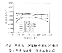 圖5為單彎頭+DN150變DN100漸縮管+單彎頭流量-儀表系數(shù)曲線。