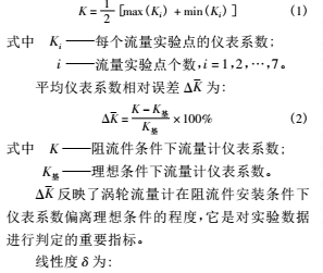 渦輪流量計的原理:當(dāng)被測流體流過傳感器時,在流體作用下,葉輪受力旋轉(zhuǎn),其轉(zhuǎn)速與管道平均流速成正比,葉輪的轉(zhuǎn)動周期改變磁電轉(zhuǎn)換器的磁阻值,檢測線圈中的磁通隨之發(fā)生周期性變化,產(chǎn)生周期性的感應(yīng)電勢,即電脈沖信號。基于渦輪流量計的測量原理,根據(jù)渦輪流量計檢定規(guī)程,確定了實流實驗結(jié)果的評價指標(biāo),其中包括: 儀表系數(shù)、平均儀表系數(shù)相對誤差、線性度和不確定度。