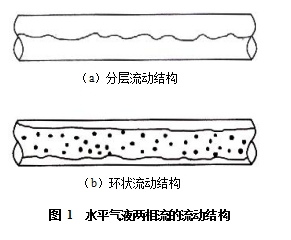 當(dāng)流速特別高的時(shí)候,也會(huì)表現(xiàn)為環(huán)狀流動(dòng),即管壁上有液膜,管道中心部分為帶液滴的氣核,由于水平流動(dòng)時(shí)重力的影響作用,下部液膜要比上部管壁的厚,如圖1(b)所示。