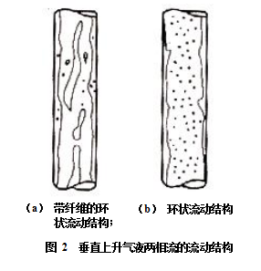 在垂直下降管道中,氣液兩相流動(dòng)的結(jié)構(gòu)與作垂直上升流動(dòng)時(shí)的結(jié)構(gòu)很相似,但有不同,不僅流動(dòng)方向相反,而且在平均流速相同的情況下,垂直下降管道中液體的流速比垂直上升管道中液體的流速快得多。