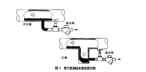疏水是否充分的標(biāo)志是蒸汽管中是否排得出凝結(jié)水。如圖8所示的配置能從后一個(gè)疏水器中的排水量獲得判斷。后一個(gè)疏水器如果極少有水排出,則表明前一只疏水器已充分疏水。